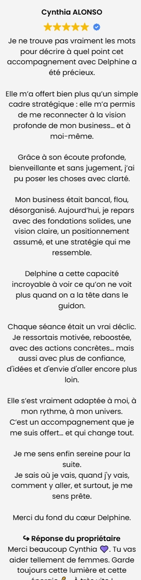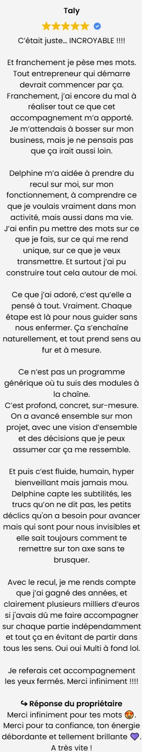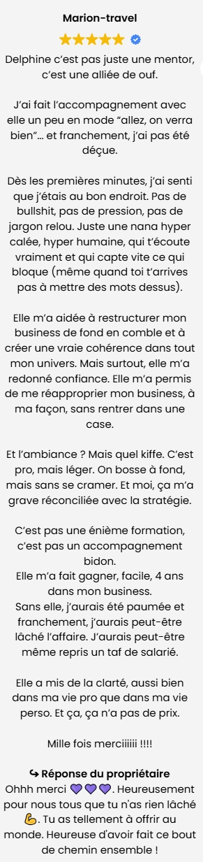 C’est parce que je veux m’impliquer à 100 % dans chaque accompagnement, et parce que toi aussi, tu mérites un cadre adapté à ton énergie, ton timing, ton stade de business.